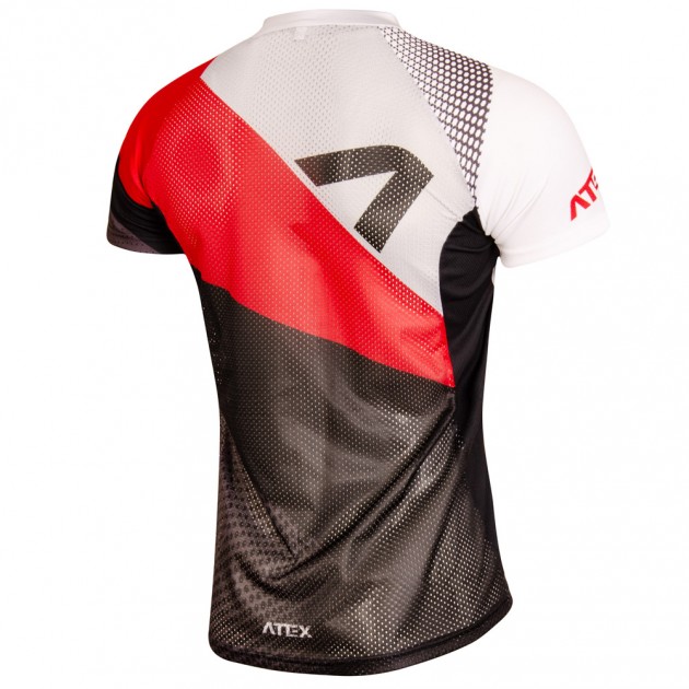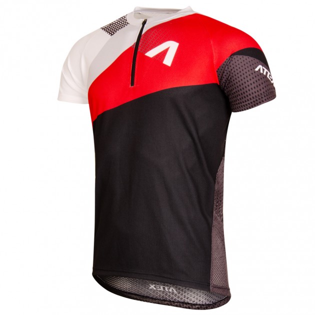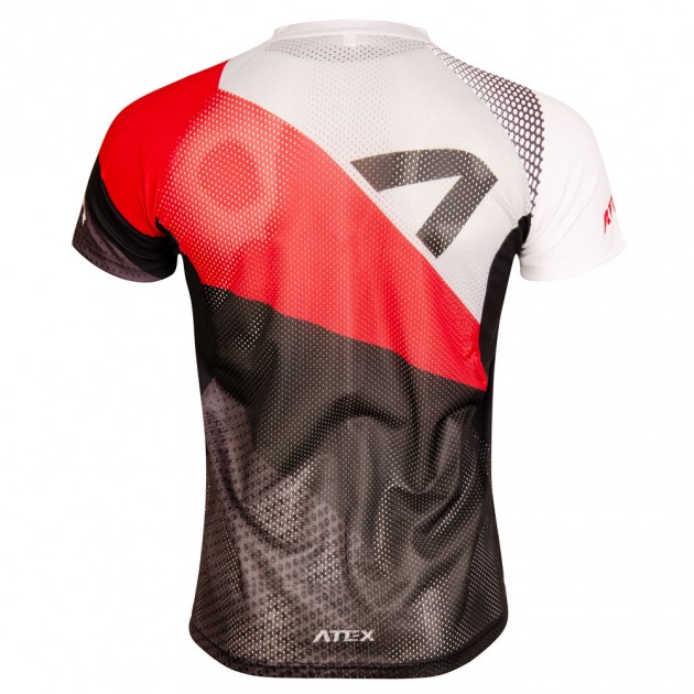 The jersey has a short zip on the front panel with a lock down system and a cover. The neckline is round and with a small hem. Short raglan sleeves and sleeve cuffs together with bottom hems are turned up without elastic. Seams in the underarm areas are almost none and invisible. These panels thanks to their placement and round shape increase comfort of a sportsman while running to the maximum.