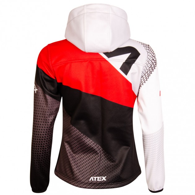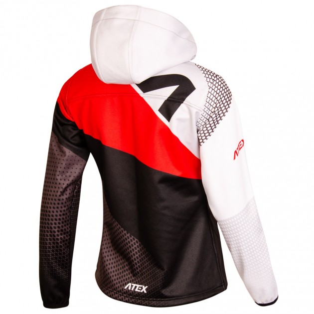 There is a full-length zip with cover and two zipper pockets on the front part. The drawstring hood can have custom print on the inner part. Set-in sleeves hemmed with elastic gripper and pre-shaped elbows, that allows free and natural arm movement. The bottom hem of the jacket has a drawstring.