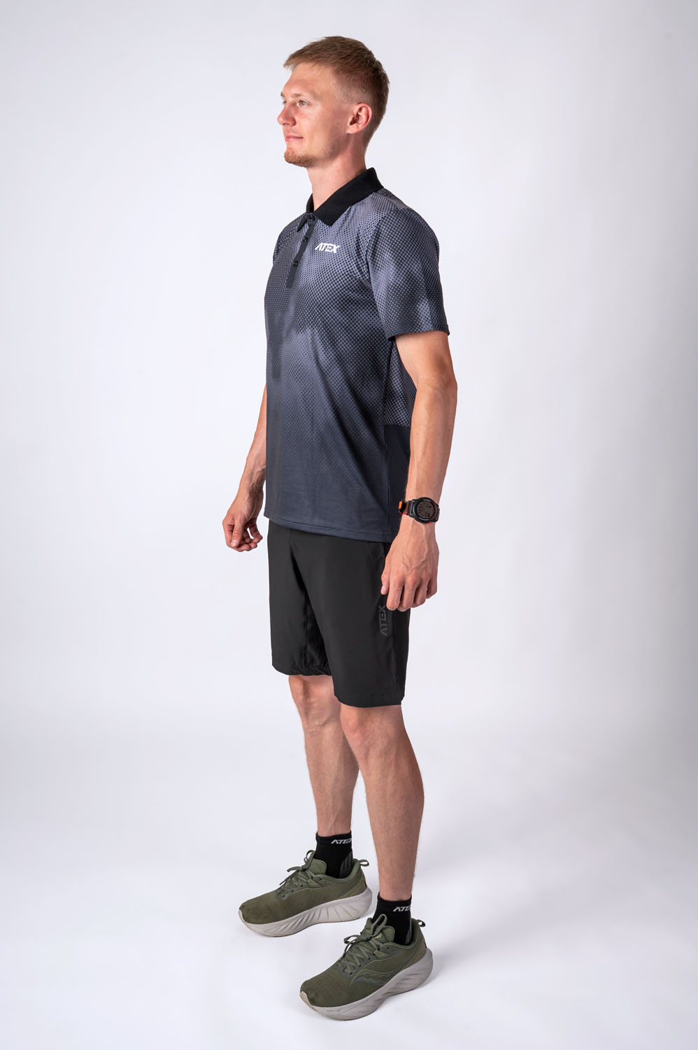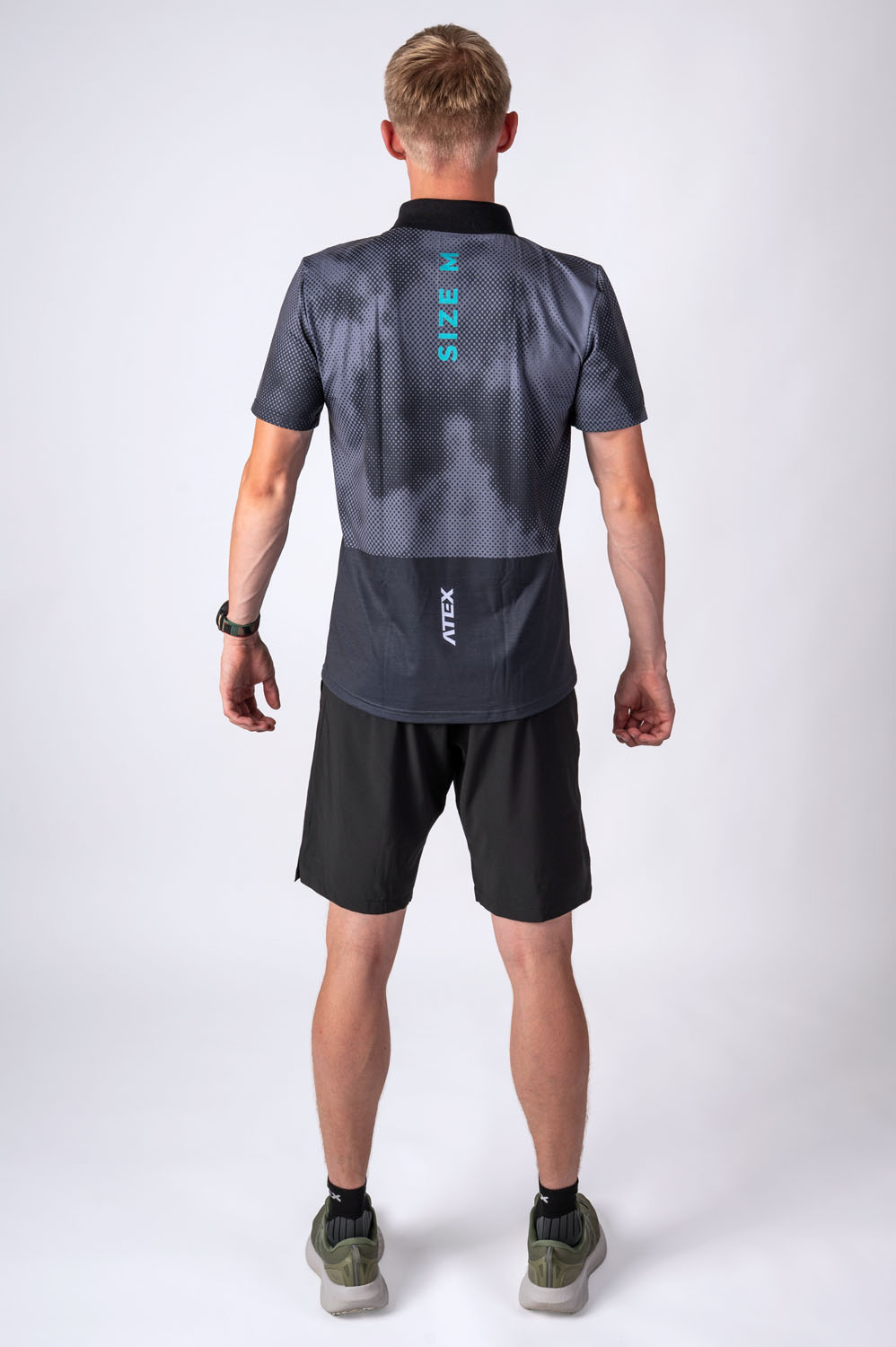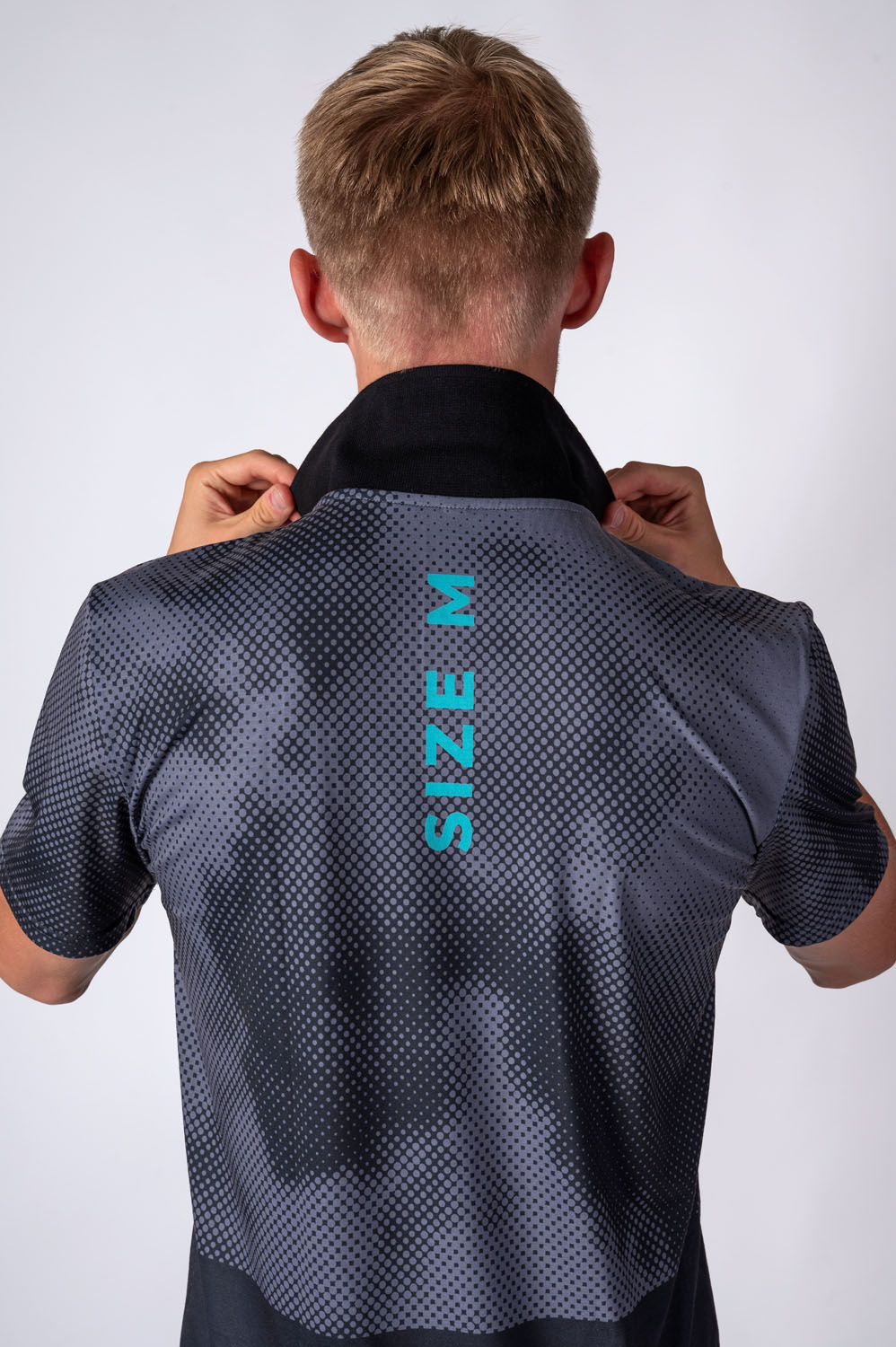Das Sporthemd mit Kragen hat einen halb taillierten Schnitt mit kurzen, angesetzten Ärmeln und einem leicht verlängerten Rücken, der den Rücken bei Bewegung besser bedeckt. Im Nacken befindet sich ein fester Kragen, der nicht bedruckt werden soll, und darunter eine Drei-Knopf-Leiste.