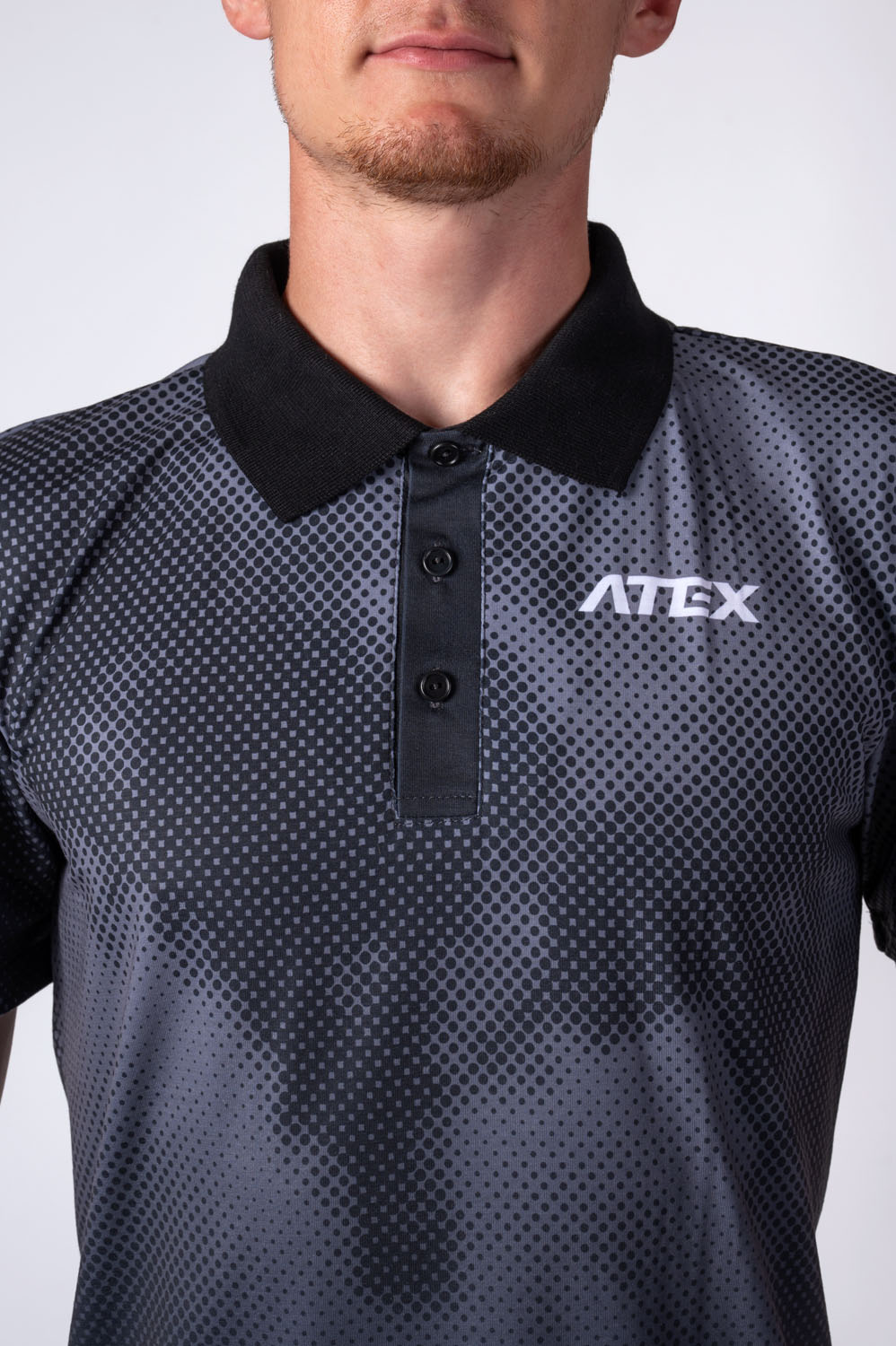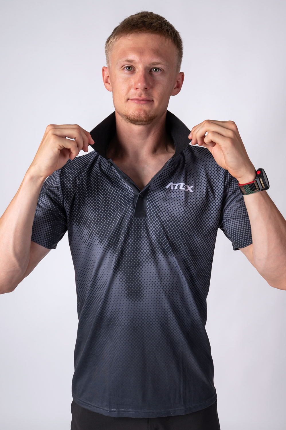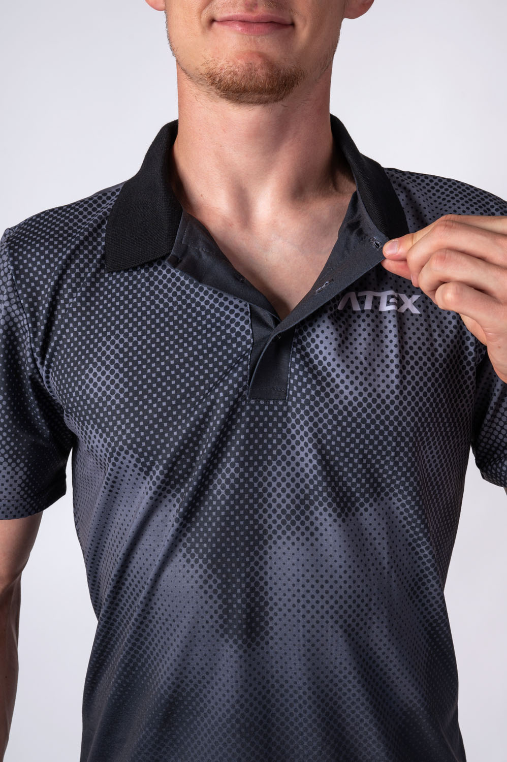 Das Sporthemd mit Kragen hat einen halb taillierten Schnitt mit kurzen, angesetzten Ärmeln und einem leicht verlängerten Rücken, der den Rücken bei Bewegung besser bedeckt. Im Nacken befindet sich ein fester Kragen, der nicht bedruckt werden soll, und darunter eine Drei-Knopf-Leiste.