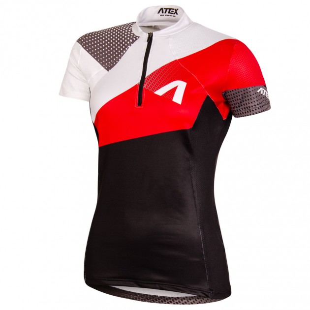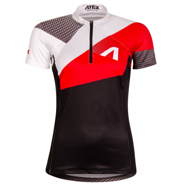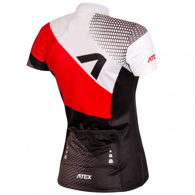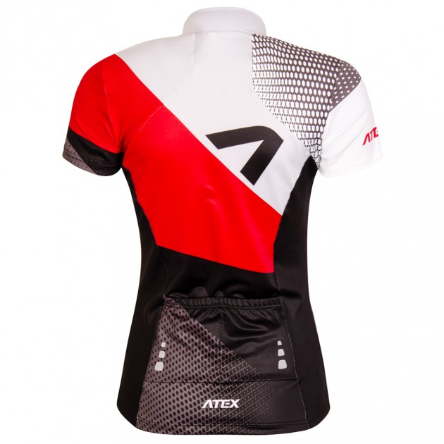 The jersey has a short zip with a cover in the front, lower stand-up collar, short set-in sleeves and double pocket with reflective strips at the back.